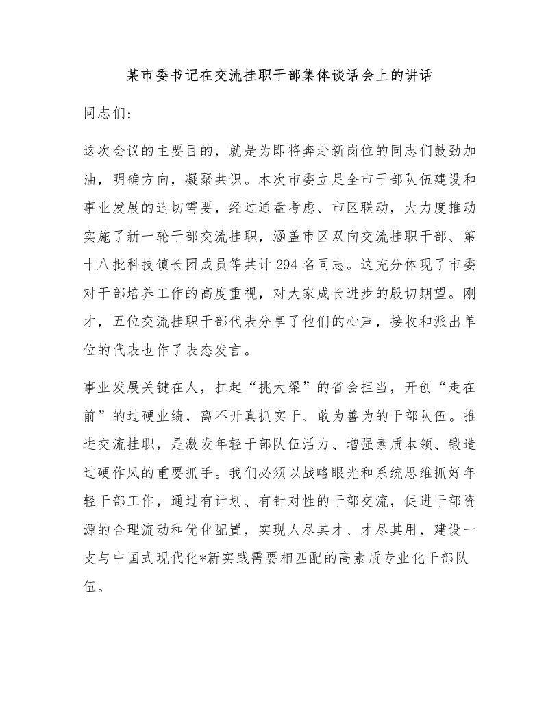 某市委书记在交流挂职干部集体谈话会上的讲话