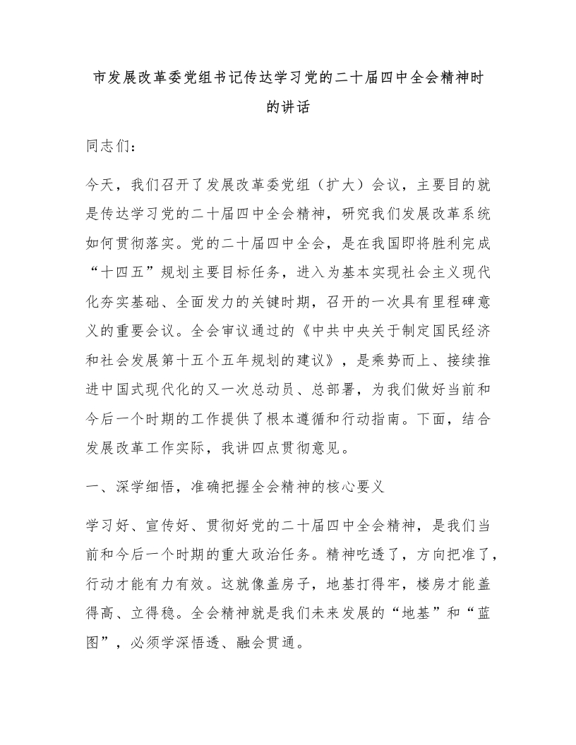 市发展改革委党组书记传达学习党的二十届四中全会精神时的讲话