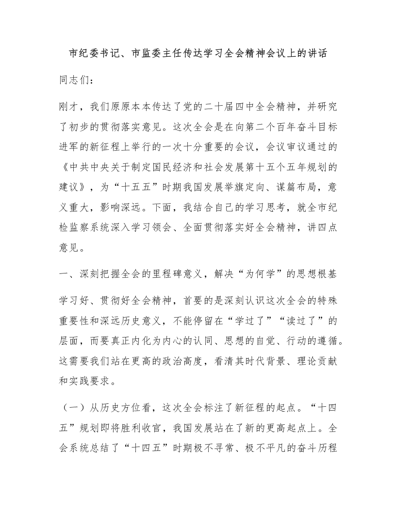 市纪委书记、市监委主任传达学习全会精神会议上的讲话