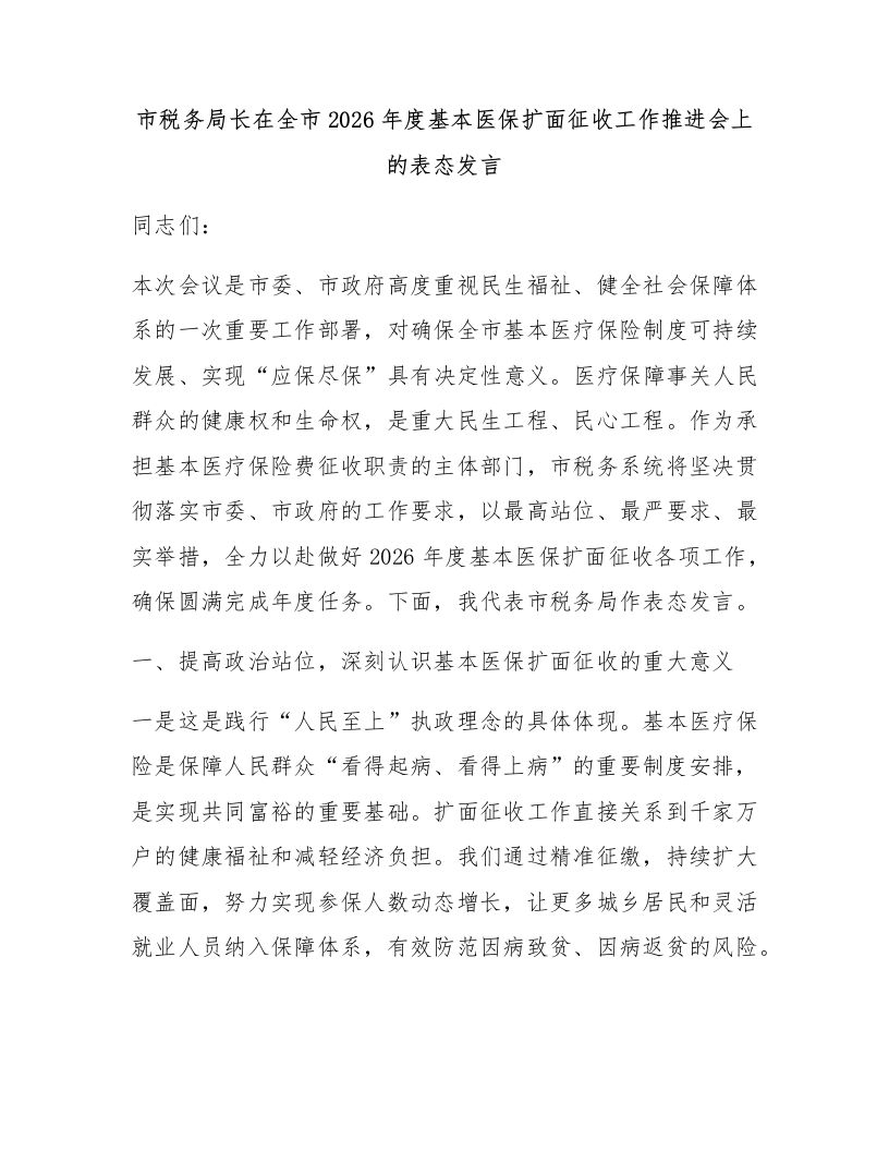市税务局长在全市2026年度基本医保扩面征收工作推进会上的表态发言