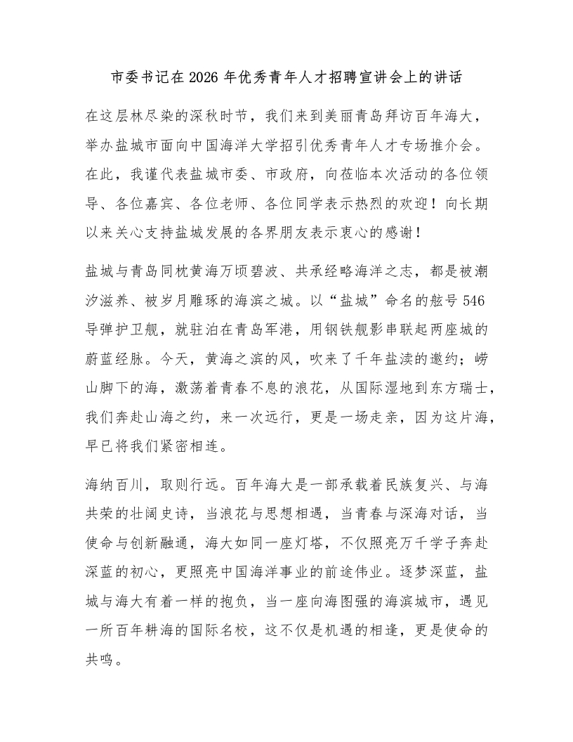 市委书记在2026年优秀青年人才招聘宣讲会上的讲话