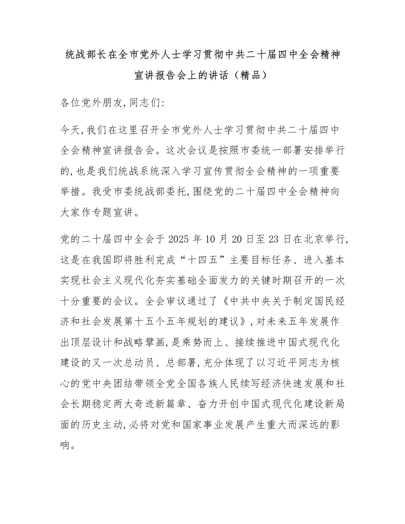 统战部长在全市党外人士学习贯彻中共二十届四中全会精神宣讲报告会上的讲话(精品)