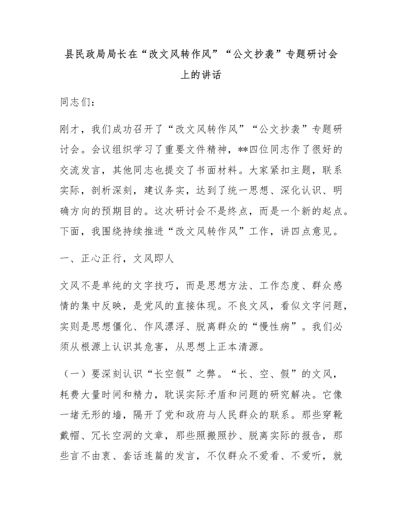 县民政局局长在“改文风转作风”“公文抄袭”专题研讨会上的讲话