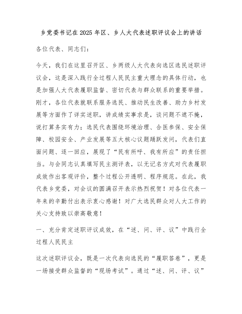 乡党委书记在2025年区、乡人大代表述职评议会上的讲话