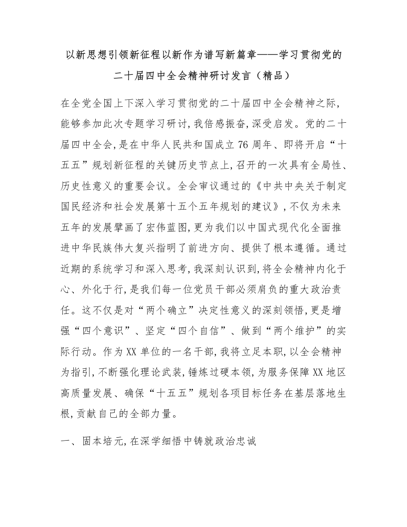 以新思想引领新征程以新作为谱写新篇章——学习贯彻党的二十届四中全会精神研讨发言(精品)