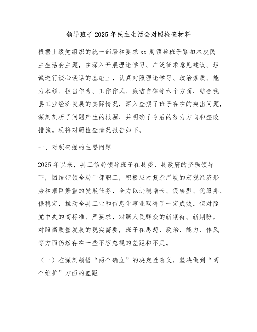 首页热门分类民主生活会领导班子2025年民主生活会对照检查材料