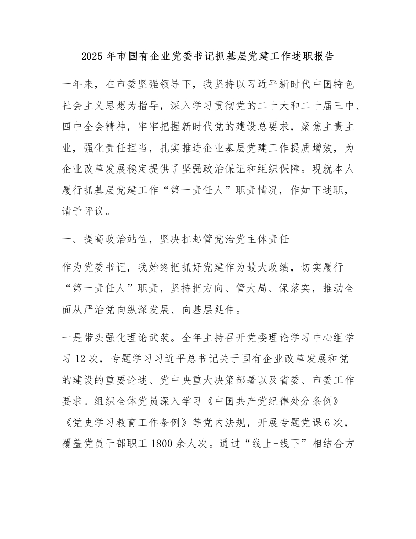 2025年市国有企业党委书记抓基层党建工作述职报告