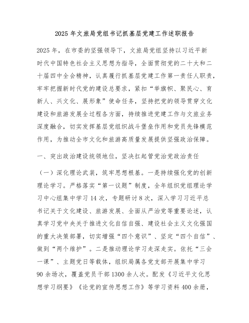 首页报告总结述职述廉2025年文旅局党组书记抓基层党建工作述职报告
