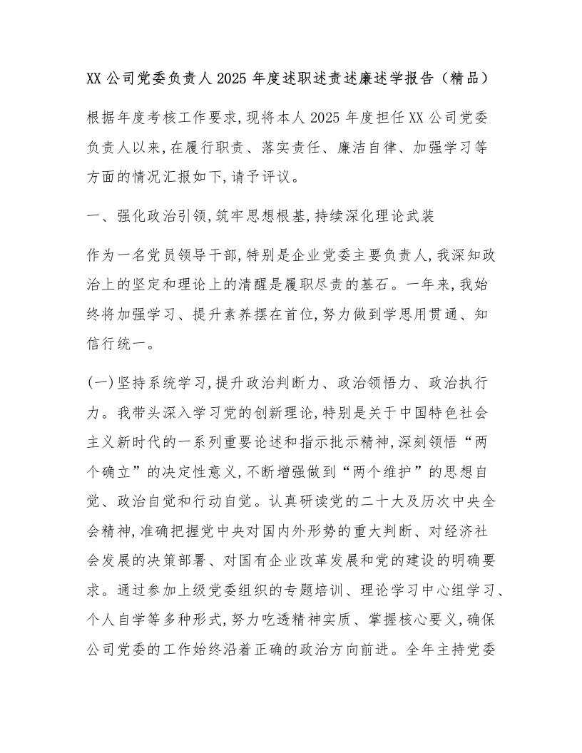 XX公司党委负责人2025年度述职述责述廉述学报告(精品)