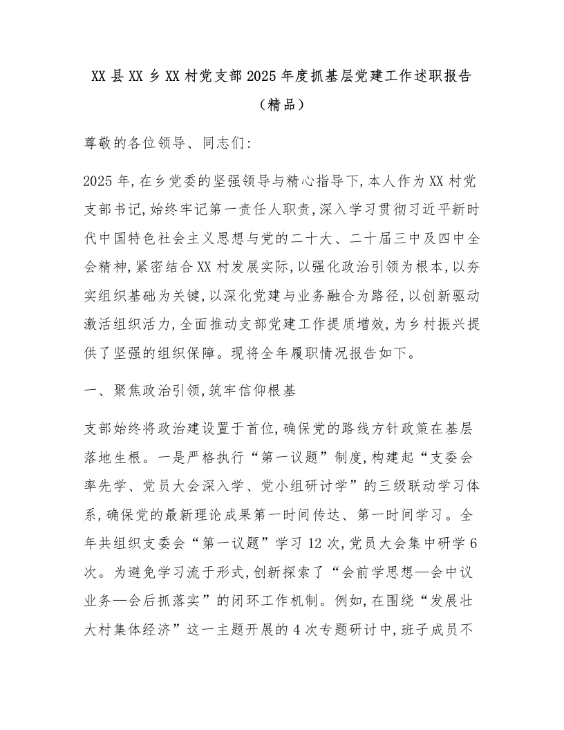 首页报告总结述职述廉XX县XX乡XX村党支部2025年度抓基层党建工作述职报告(精品)