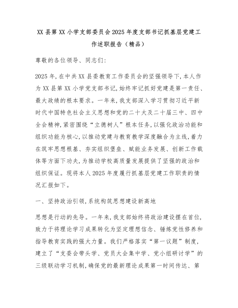 XX县第XX小学支部委员会2025年度支部书记抓基层党建工作述职报告(精品)