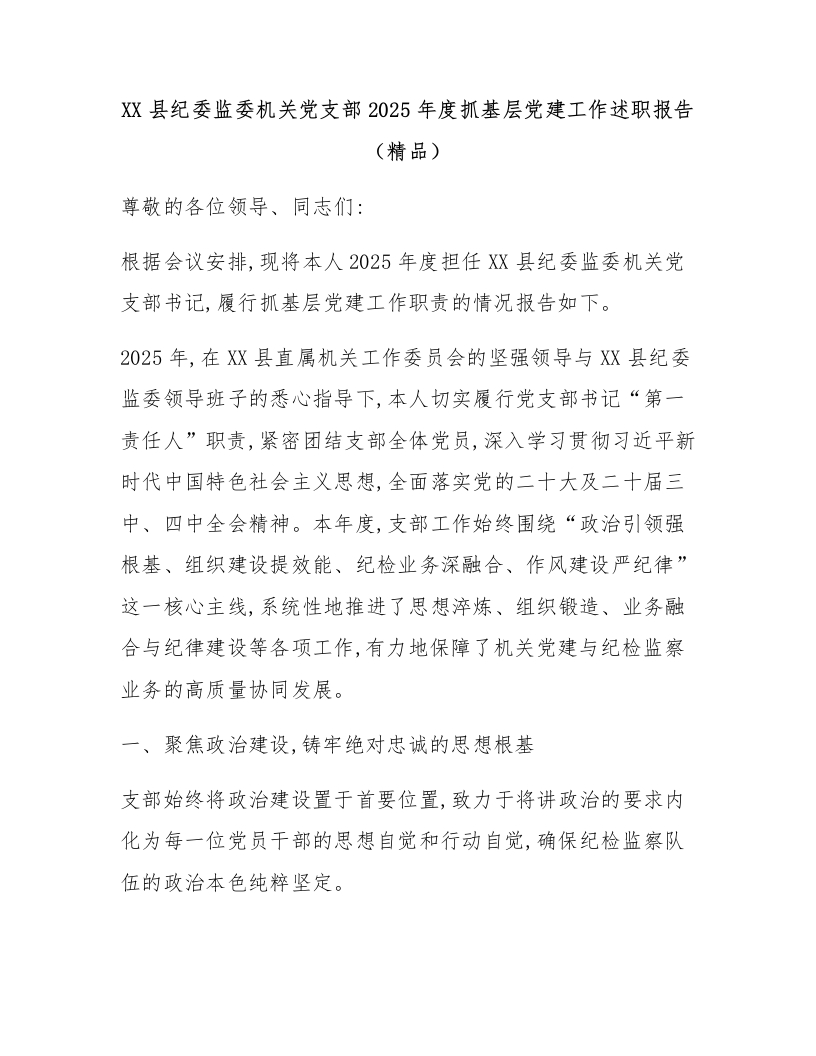 XX县纪委监委机关党支部2025年度抓基层党建工作述职报告(精品)