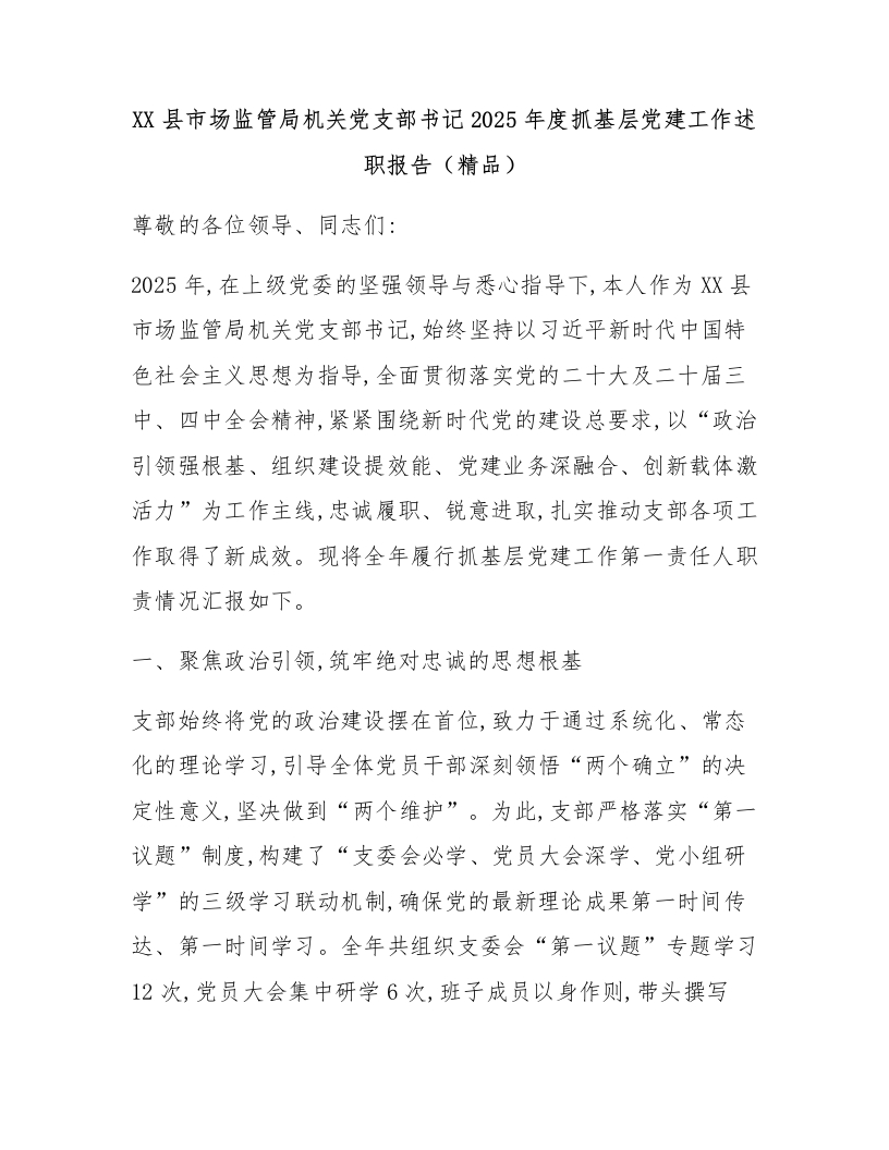 XX县市场监管局机关党支部书记2025年度抓基层党建工作述职报告(精品)