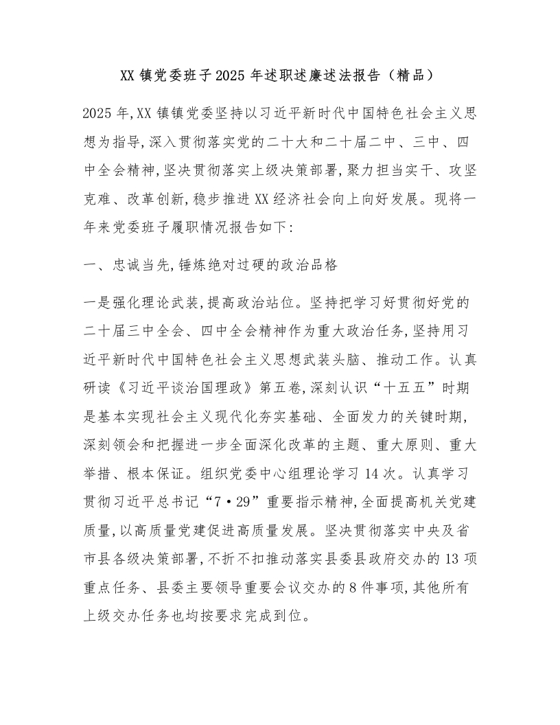 XX镇党委班子2025年述职述廉述法报告(精品)