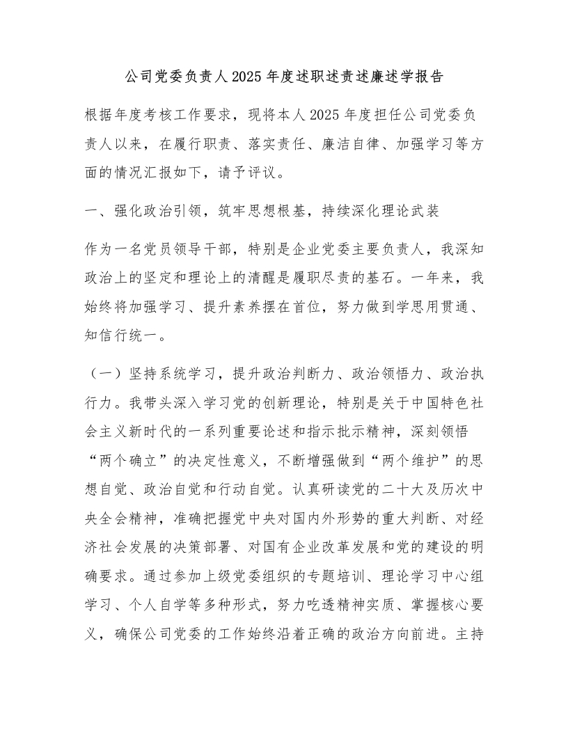 首页报告总结述职述廉公司党委负责人2025年度述职述责述廉述学报告