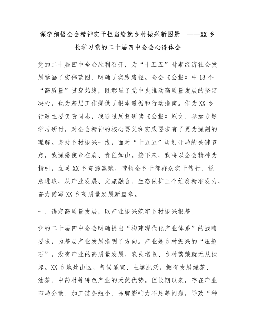 深学细悟全会精神实干担当绘就乡村振兴新图景 ——XX乡长学习党的二十届四中全会心得体会