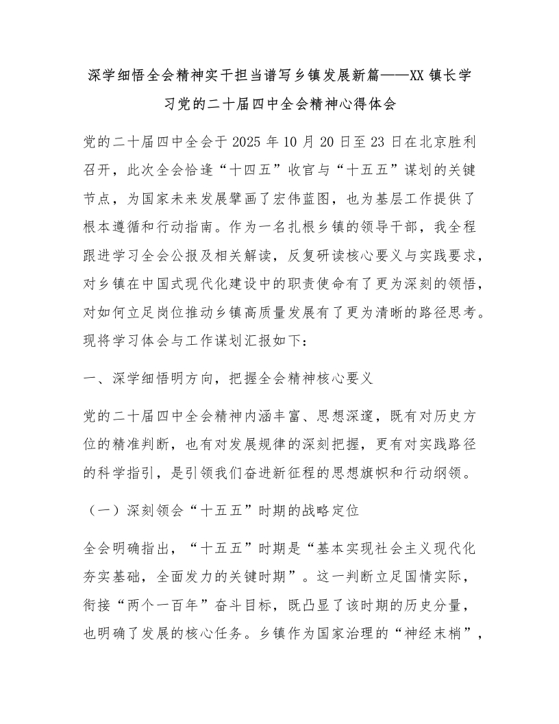 深学细悟全会精神实干担当谱写乡镇发展新篇——XX镇长学习党的二十届四中全会精神心得体会