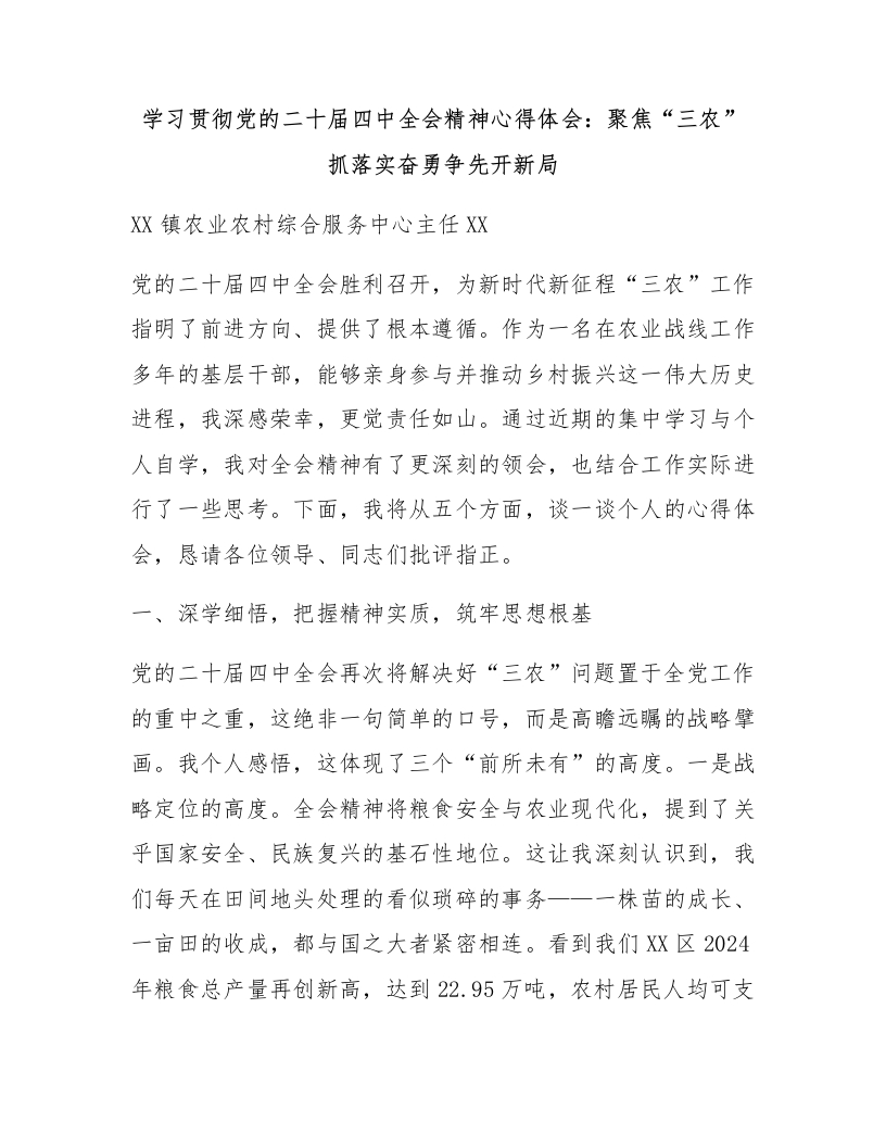 学习贯彻党的二十届四中全会精神心得体会:聚焦“三农”抓落实奋勇争先开新局