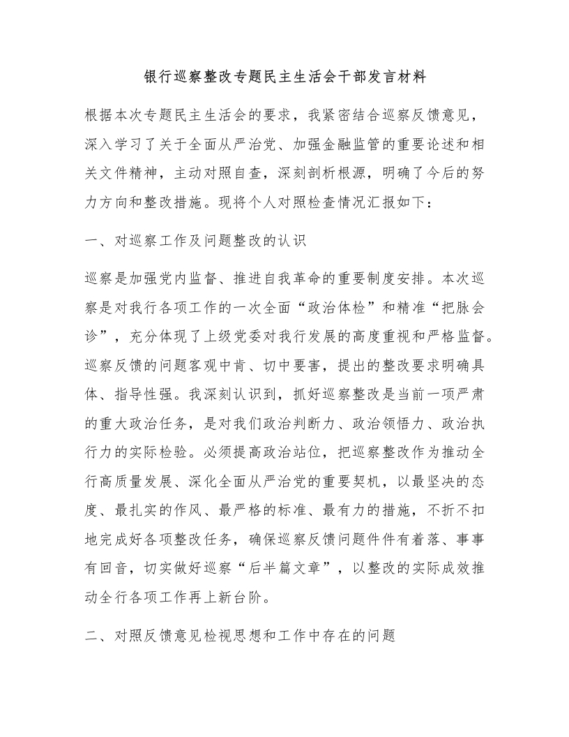 银行巡察整改专题民主生活会干部发言材料