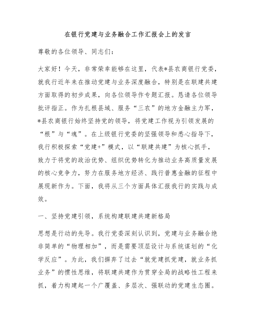 在银行党建与业务融合工作汇报会上的发言