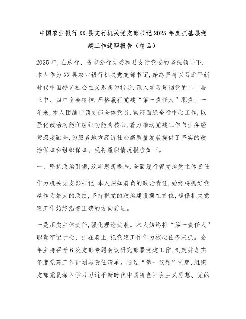 中国农业银行XX县支行机关党支部书记2025年度抓基层党建工作述职报告(精品)